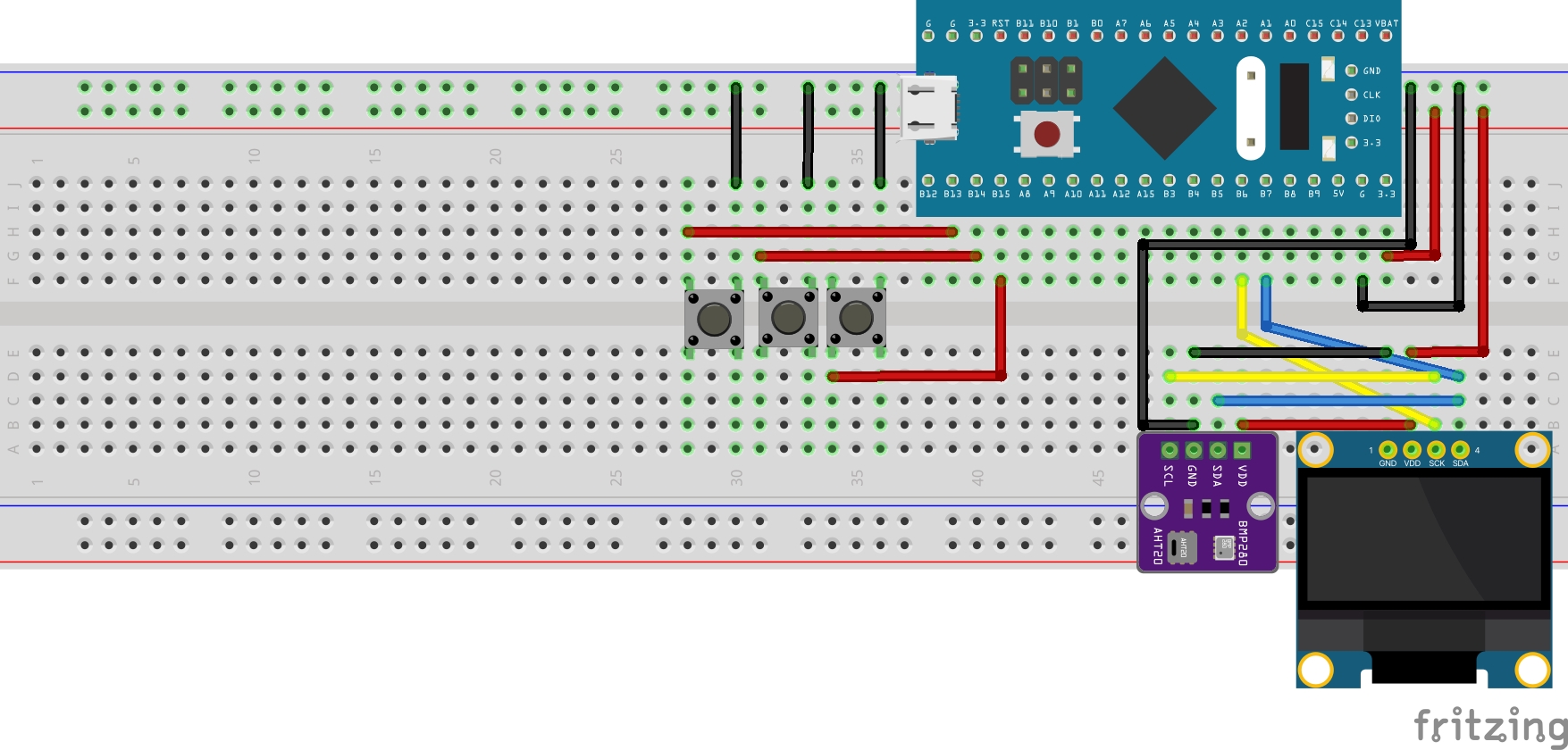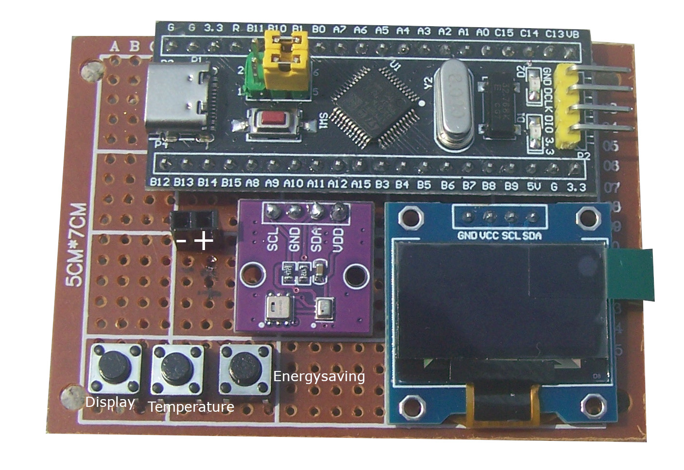 That use STM32F103 development board, BMP280/AHT20 sensor, OLED display, three buttons, two pin female connector. All are soldered in one 5cm*7cm Perfboard.