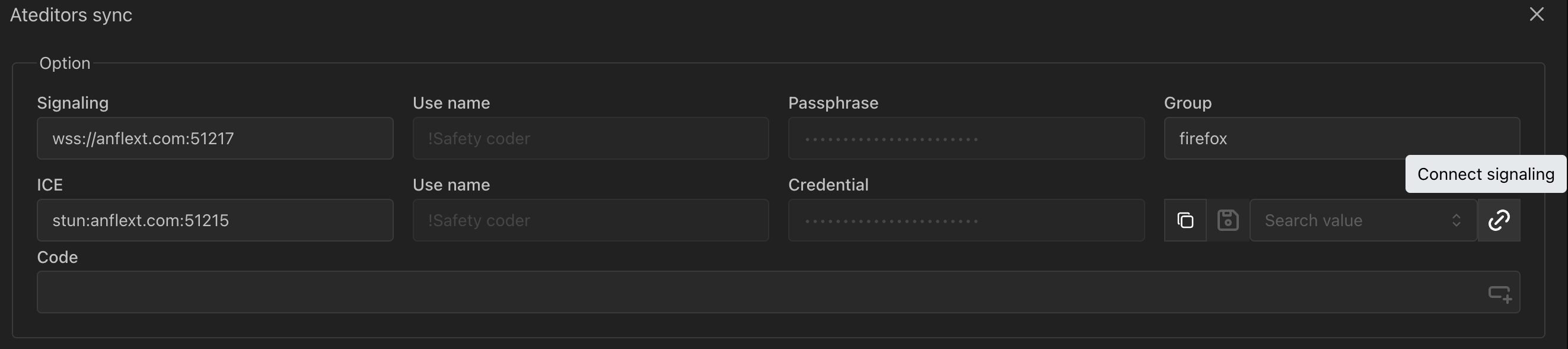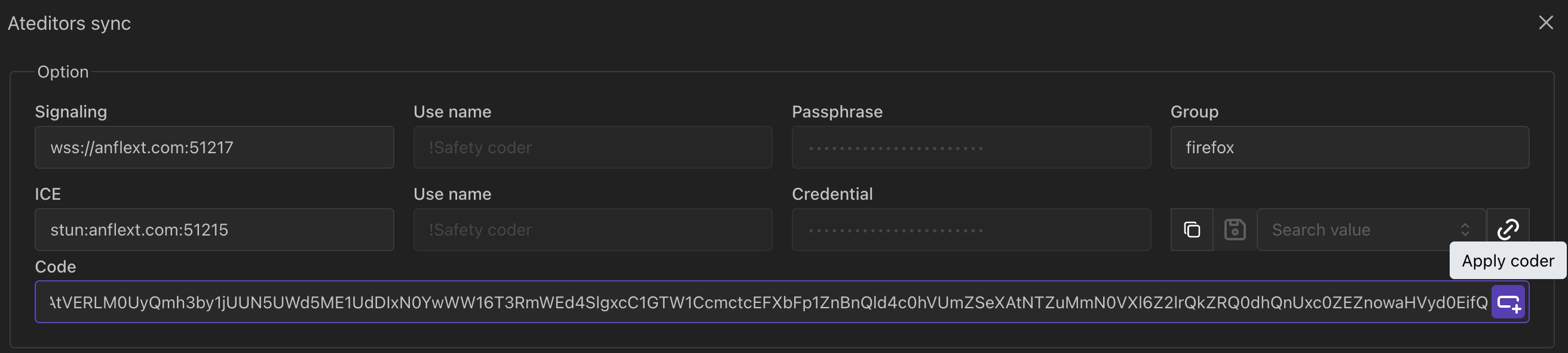 eyJpY2UiOnsidXJsIjoic3R1bjphbmZsZXh0LmNvbTo1MTIxNSJ9LCJsYWJlbCI6InRlc3QiLCJzaWduYWxpbmciOnsiZ3JvdXAiOiJmaXJlZm94IiwidXJsIjoid3NzOi8vYW5mbGV4dC5jb206NTEyMTcifSwic3NpciI6IjdCT09PWXNUN0VvTE4tY05VSUlZdTZUcFNOQ3ZWVFZtZ2dCSE5DeVY0Tjd6dE1VOXJ4TlJYeWl2LUJtZTlBMzg3WHljYUNSU1d0RWRKNXRBUlY3UFkxZkhEYlV3UW9sNVBLZXg0WHo0anZ4QnRxRGNmSlFDVEh2RnhDWmprdGc0bk9qWGhOdkxjN252cjIwdWtFeFBhWkFhVFhsYjFpVGlLV0RCekZZQzZJTXVHVTVQOXo0MVdaSF83SVZLRFZjWkJfalhDRjVzMmxIQnNDNEZRVUxLbjcyTDVGTmJjZlRGUmxhalFDc0o1eVBtM2pBSnVLTHAtVERLM0UyQmh3by1jUUN5UWd5ME1UdDIxN0YwWW16T3RmWEd4SlgxcC1GTW1CcmctcEFXbFp1ZnBnQld4c0hVUmZSeXAtNTZuMmN0VXl6Z2lrQkZRQ0dhQnUxc0ZEZnowaHVyd0EifQYon can fill the coder in ateditors sync option code field and press Apply coder button to fill option fields of sync.
