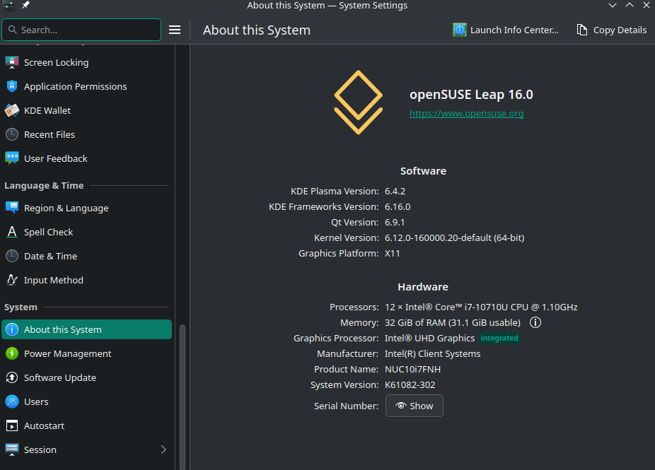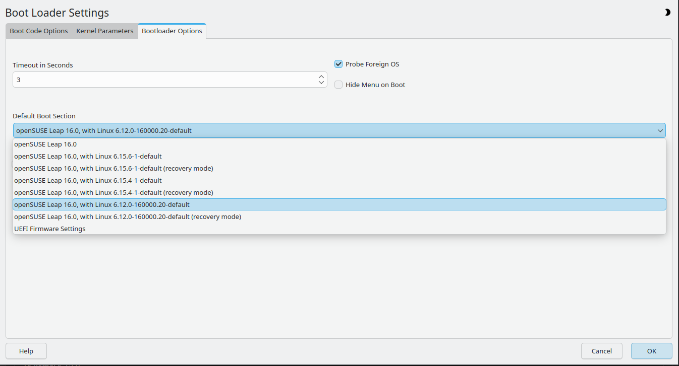 After installed all packages and restart, all is OK. But I verify the kernel version to find that is Tumbleweed kernel 6.15.6. So I need to change /boot/grub2/grub.cfg to Leap 16 kernel 6.12.0 using YaST Boot Loader like this: